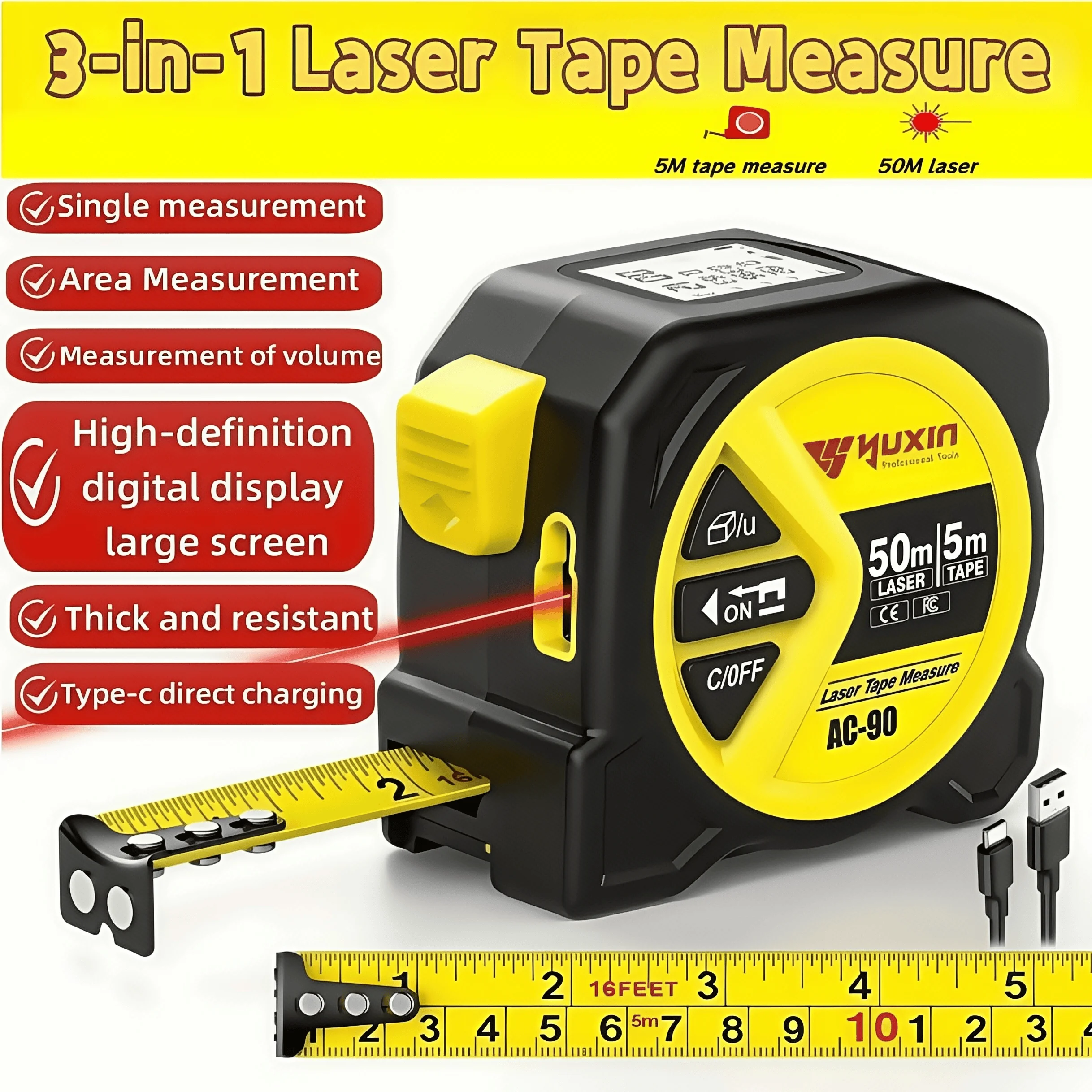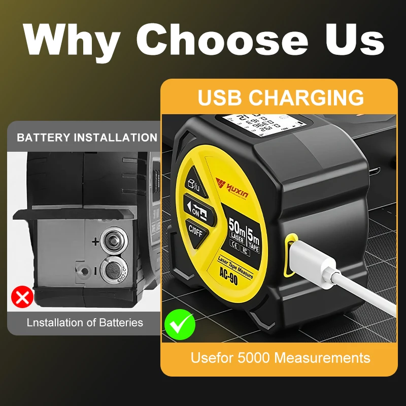 50m Laser 5m Steel Tape Measure - Digital Display Durable Non-slip Accurate Measurement Hook Loop 1PC